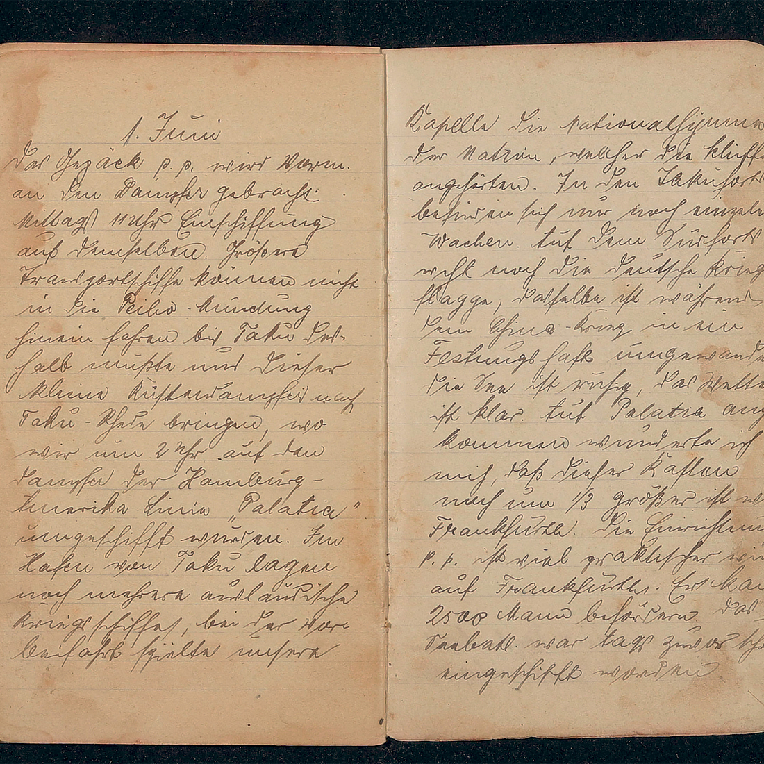 There was no special preparation for the upcoming deployment in China for the soldiers and previous prejudices about the Chinese were not questioned during the crossing. This pronounced racism then came to light when the Germans were deployed in China. There are numerous private documents about the conditions of the crossing in the form of war diaries. The DSM archive also contains a fragment of a diary of a member of the second naval battalion who is unfortunately no longer known by name (Fig. 1). In all the diaries of the German soldiers involved, the description of the extreme temperatures on the ships during the crossing of the Red Sea takes up a certain amount of space.