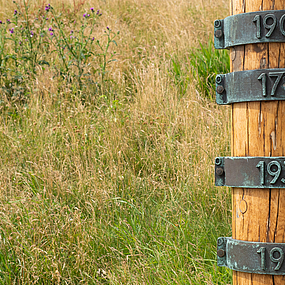 Der eichene Sturmflutpfahl, erinnert an die ständige Gefahr, die der Küstenlandschaft und ihren…