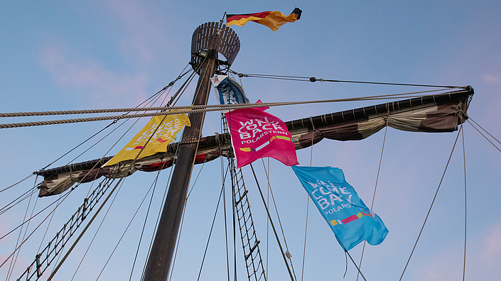 Der Rumpf des Schiffes setzt sich in Bewegung und langsam zieht die Silhouette der Havenwelten an uns vorbei. Während wir in der Schleuse darauf warten, dass die vielen kleinen Segler festmachen, glitzern die Lichter der Stadt in der Dunkelheit des Morgens. Die vielen bunten „Welcome back POLARSTERN“-Fahnen wehen in der leichten Brise. Als die Schleusentore sich öffnen, herrscht Aufbruchsstimmung. Kaum einer sitzt an den mit Lichterketten beleuchteten Tischen. Alle stehen an der Reling, die Kamera oder das Handy in der Hand, still vor Neugierde. Es geht los. Unser Ausflug zur POLARSTERN kann starten.