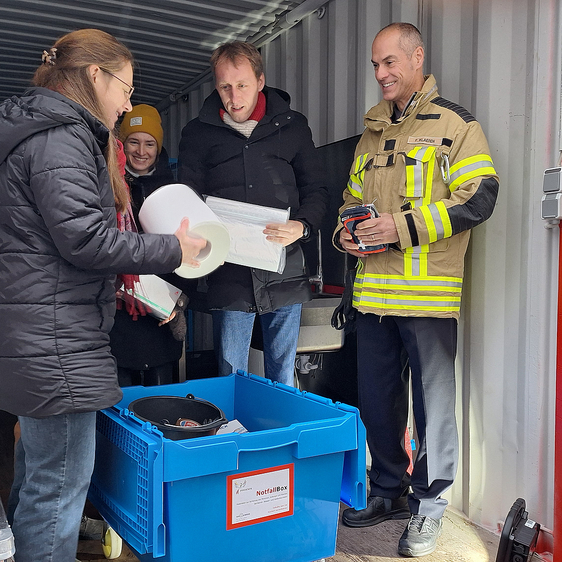 Die Notfallbox wird von Dr. Julia Kahleyß (Archivdirektorin Stadtarchiv Bremerhaven), Silke Wiedmann (DSM), Prof. Dr. Hauke Hilz und Frank Klaeßen (Feuerwehr) inspiziert (v.l.n.r.). Foto: Sören Kuhr