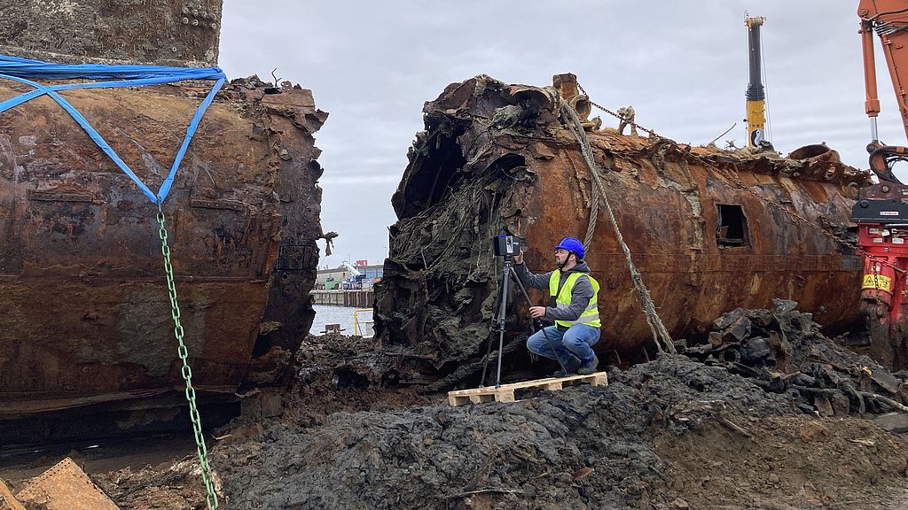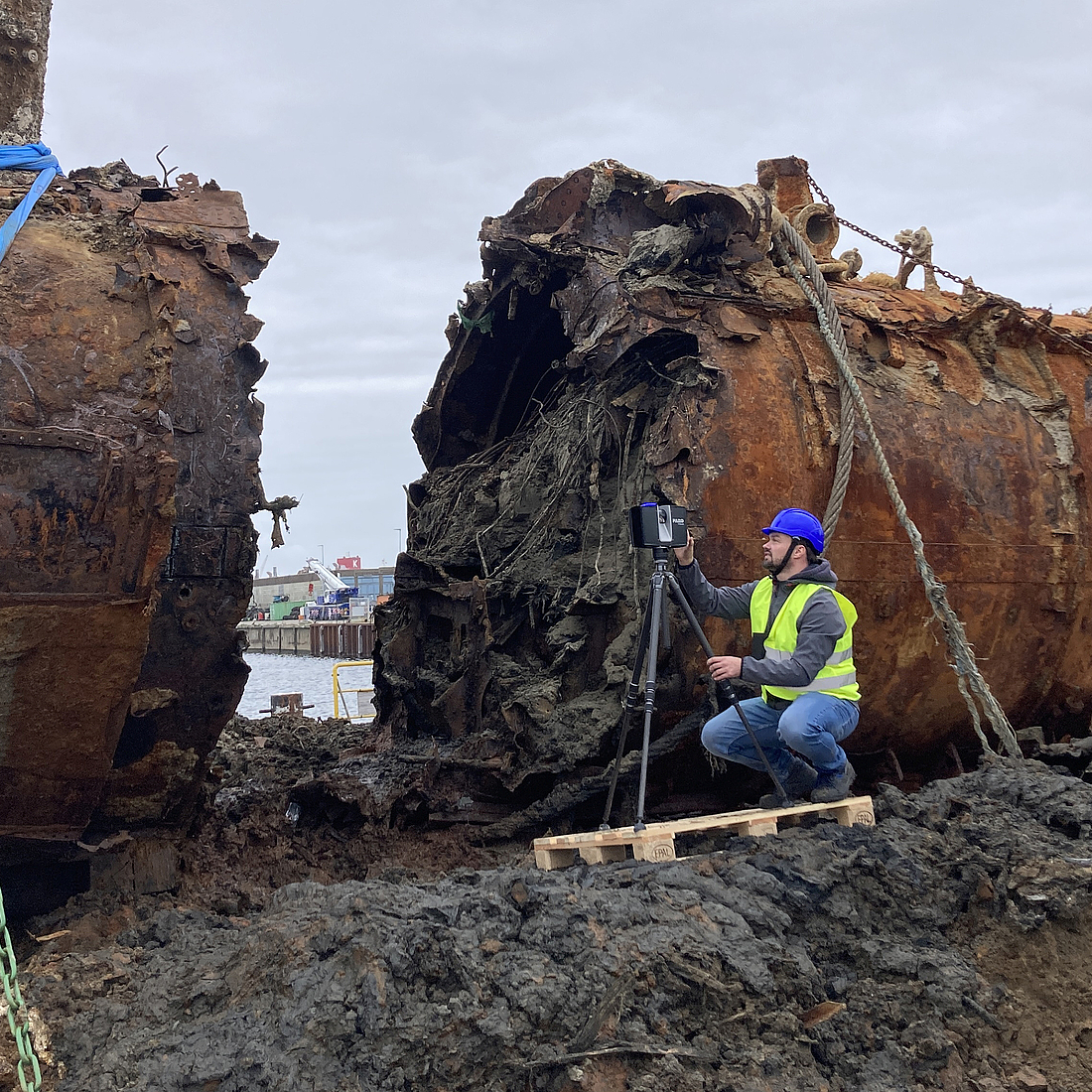 Eine fragile, überdimensionierte Röhre wurde im Sommer vor Cuxhaven aus der Nordsee gehievt. Der Fund entpuppte sich als das Unterseeboot U16 aus der Kaiserzeit. Das Deutsche Schifffahrtsmuseum (DSM) / Leibniz-Institut für Maritime Geschichte war sofort interessiert und holt nun ein Stück des U-Boots nach Bremerhaven – dank der Digitalisierungsabteilung des Museums.