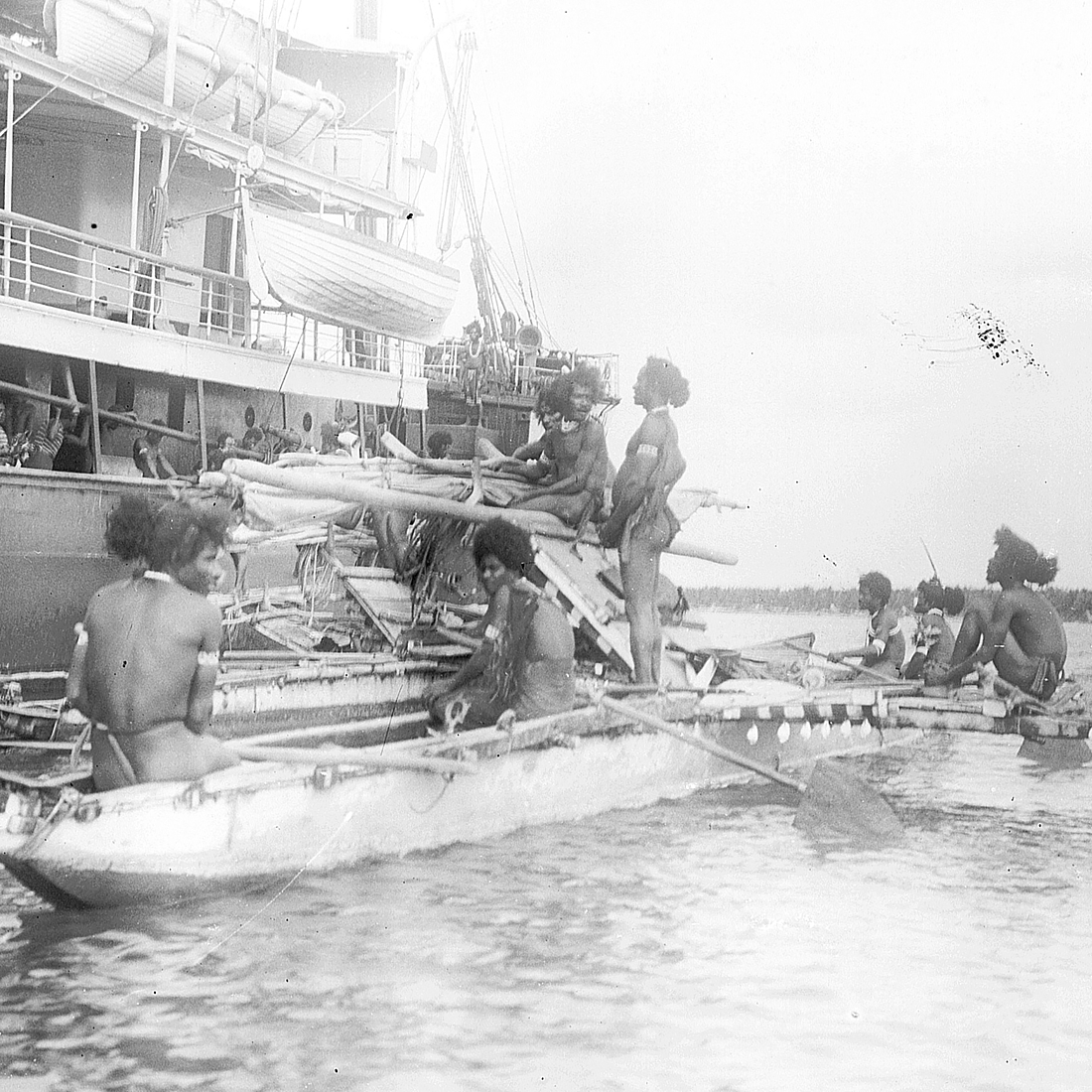 Südsee-Sammlung Obergünzburg, 02793-9, 1909, Komuli / Manus (Admiralitätsinseln), Auslegerkanus mit Männern, von Bord aus fotografiert; Handel zwischen "Sumatra" und Einheimischen, 9 x 12 SW - Verfahren auf Glasträger CC-BY Karl Nauer / Südsee-Sammlung Obergünzburg